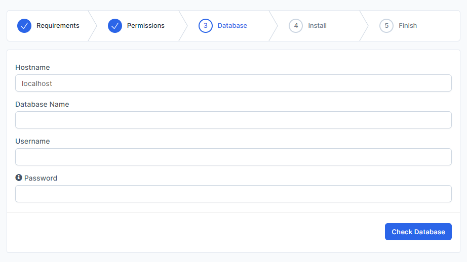 Click Check Database and if the database connection is successfully you will be passed to the latest step otherwise please re-check your credentials and hostname. (usually hostname is localhost but you should check with your hosting provider or cPanel)